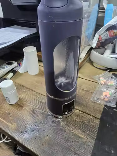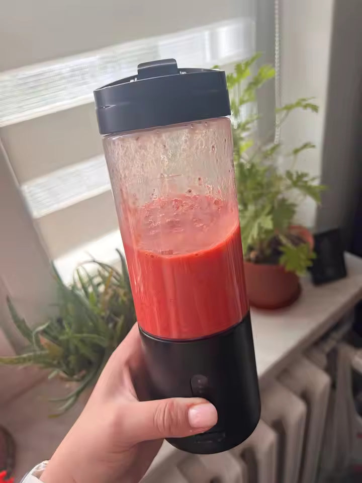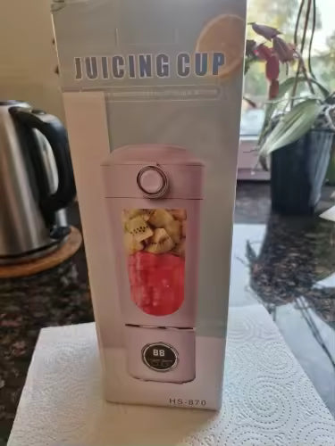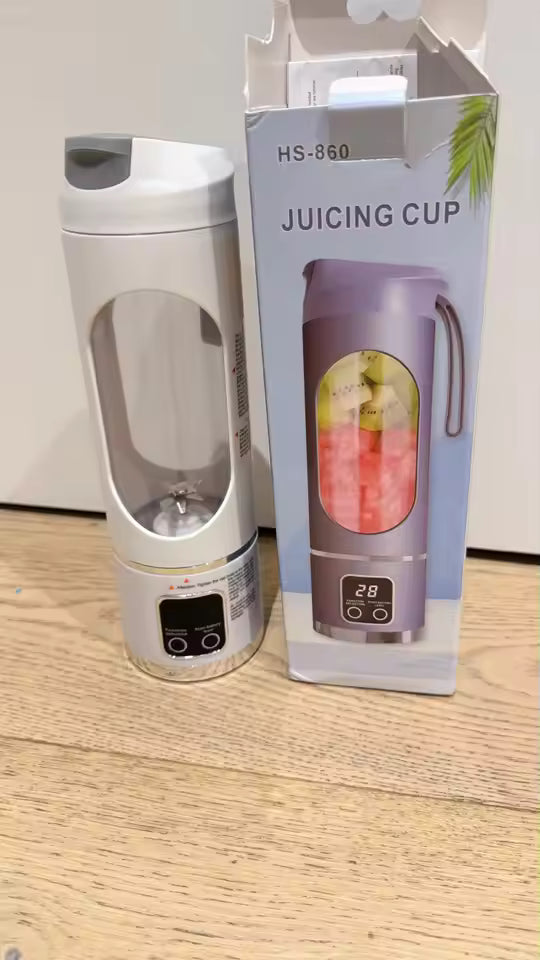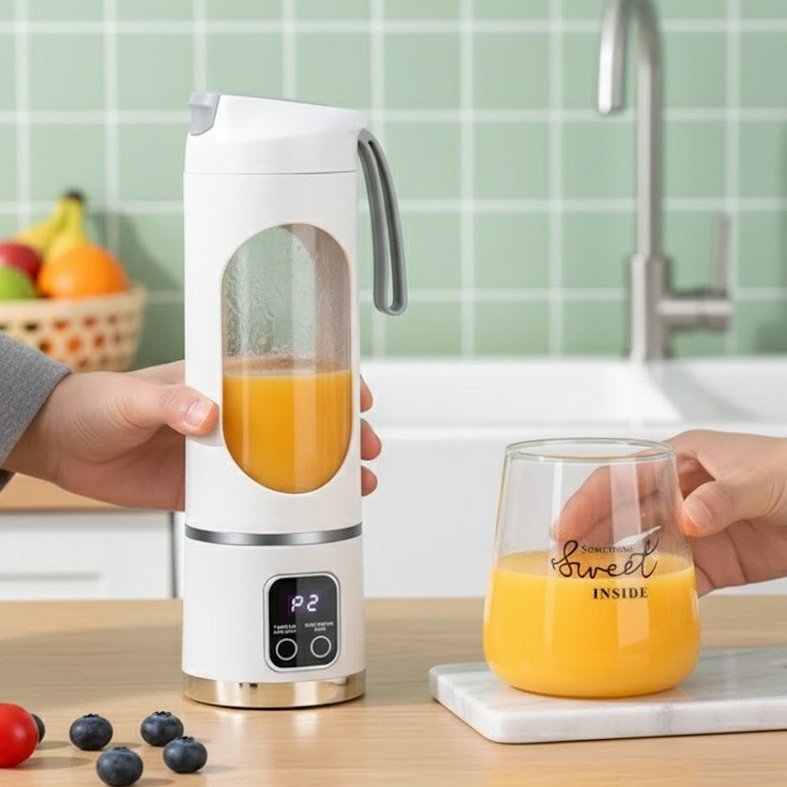 This image highlights the convenience of a portable juicer built for daily home use. The sleek vertical design makes it easy to handle, while the transparent chamber showcases fresh juice ready to pour. The kitchen setting emphasizes everyday practicality, perfect for quick breakfasts, healthy drinks, and effortless nutrition on the go.